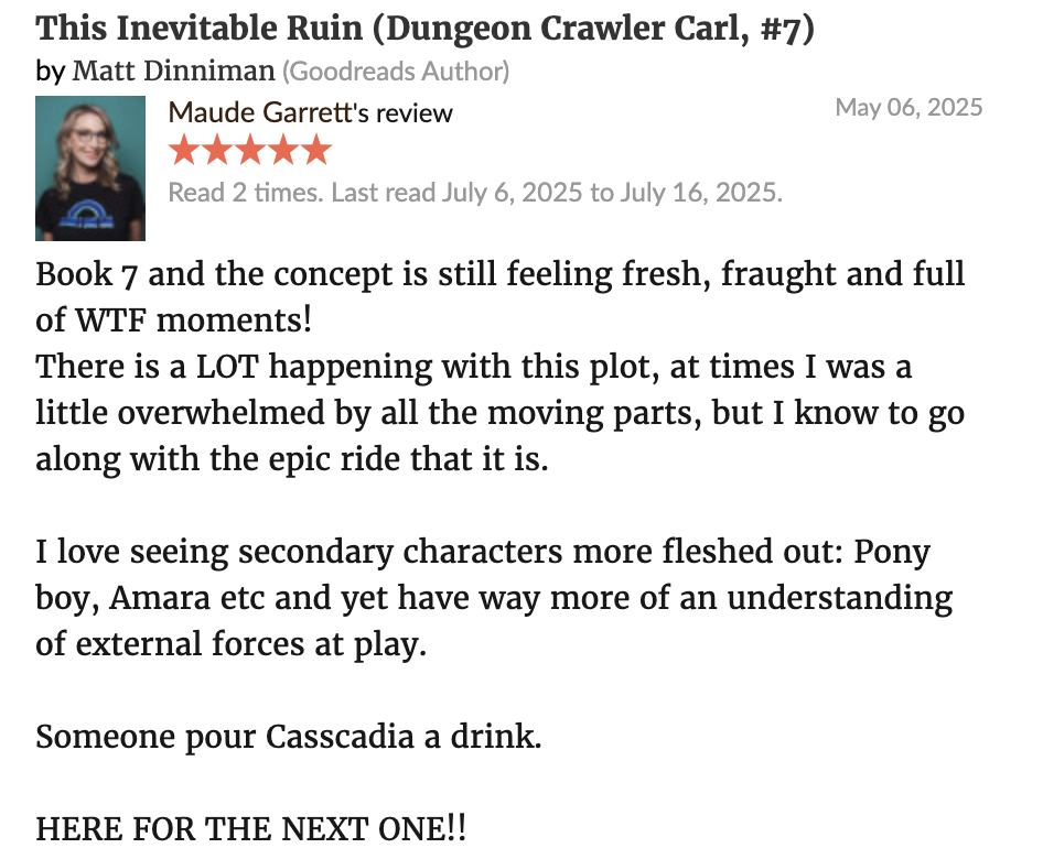 At Maude’s Book Club, LITRPG is where it’s at. We love our gaming, and Matt Dinniman brought it to our love of novels as well. We have been going through the Dungeon Crawler Carl series with our book club, and Dinniman’s books keep getting better. If you’re a fan, come and join our Discord to get into some pretty fun discussions!